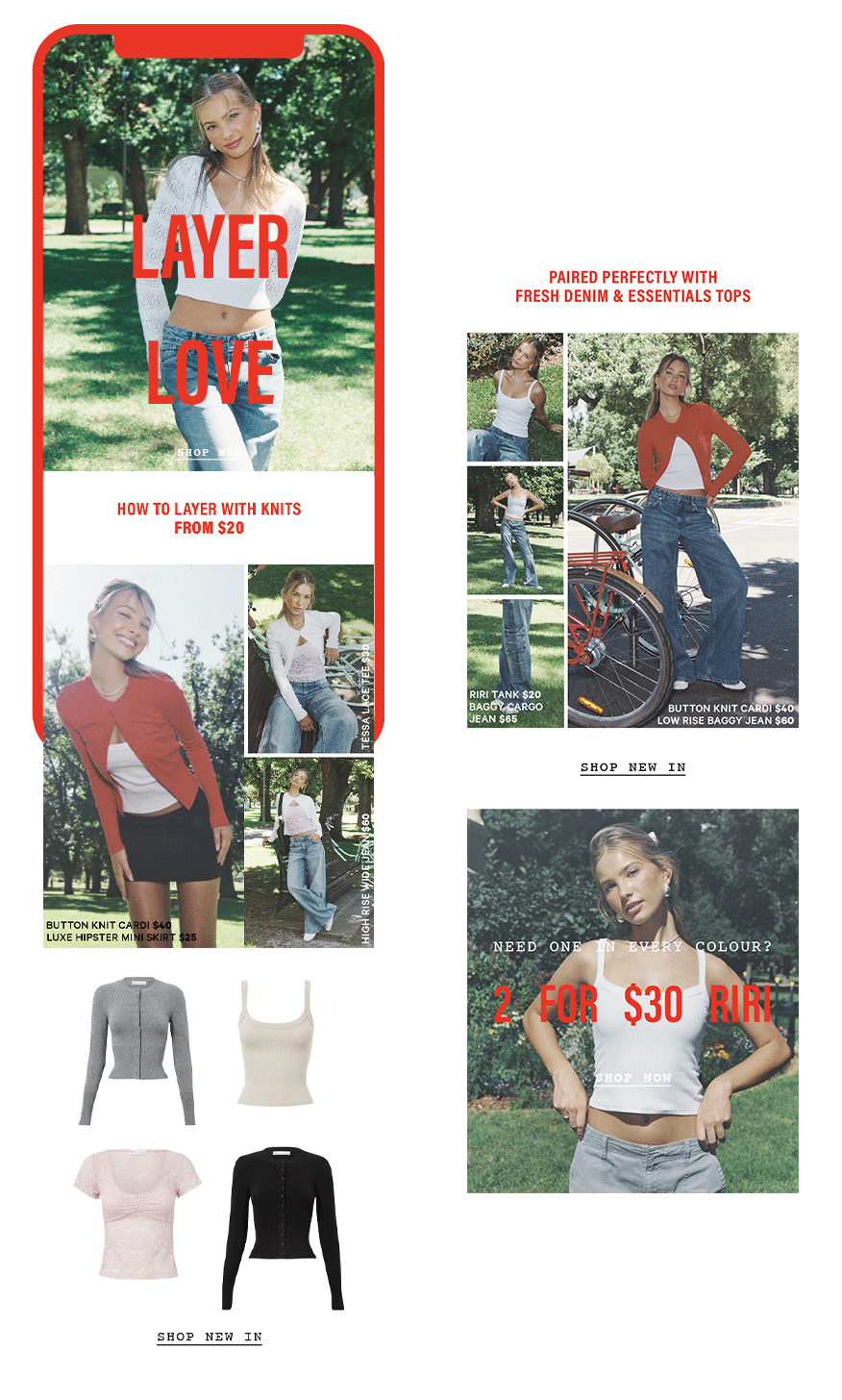 The Layer Love campaign aimed to inspire our customer to embrace the art of layering as the cooler months approached. As the seasonal shift began, we positioned layering not just as a styling necessity but as a fashion statement. Drawing inspiration from the trending ‘Scandi girl’ aesthetic, our visual direction leaned into minimalism with a bold edge featuring clean typography, structured grid layouts, and carefully considered spacing to create a modern, elevated feel.