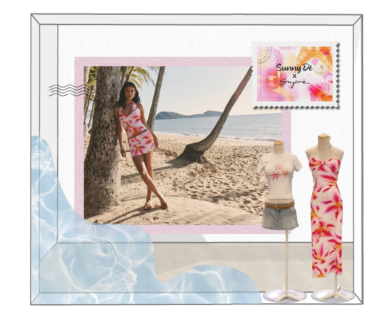 The creative direction centred on a high-summer escape: bold prints, beach textures, palm trees and ocean-breeze energy. The goal was to immerse customers in this world at every touchpoint - from the moment they entered store to how the product felt on body.
